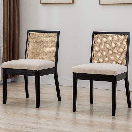 VESCASA Upholstered Dining Chairs with Square Rattan Back, Armless Padded Linen Cushion Dining Chairs with Wood Legs for Dining Room, Kitchen, Set of 2, Black Frame