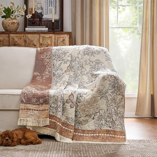 JINCHAN Boho Floral 100% Cotton Blanket 4-Layer Throw Blanket with Tassel Taupe and White Flower Butterfly Soft Luxury Rustic Farmhouse Decor Blanket for Couch Bed 80x90 inch All Season gift for women