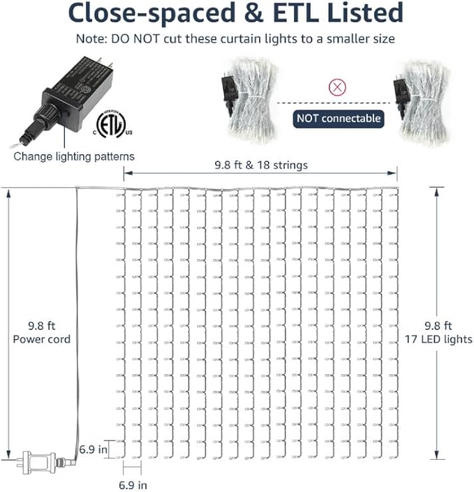 - [High Density Hang Down Fairy Lights] With 18 vertical strands, the spacing between each vertical strand is only 6.9 inches, providing a denser and more captivating display compared to curtain fairy lights with only 10 strands (13.1 inches apart).