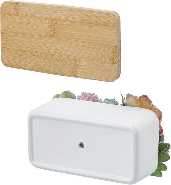- Features a sleek white ceramic pot and a removable bamboo tray