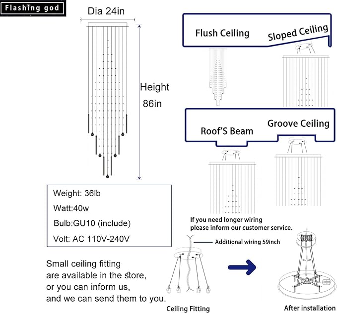 - 【Installing High Ceiling Chandelier】Flush mount ceiling fixture, ASSEMBLY REQUIRED! In order to save your time,We have hanged the complicated wire on the ceiling plate of the lamp.There are professional installation instructions in the box.