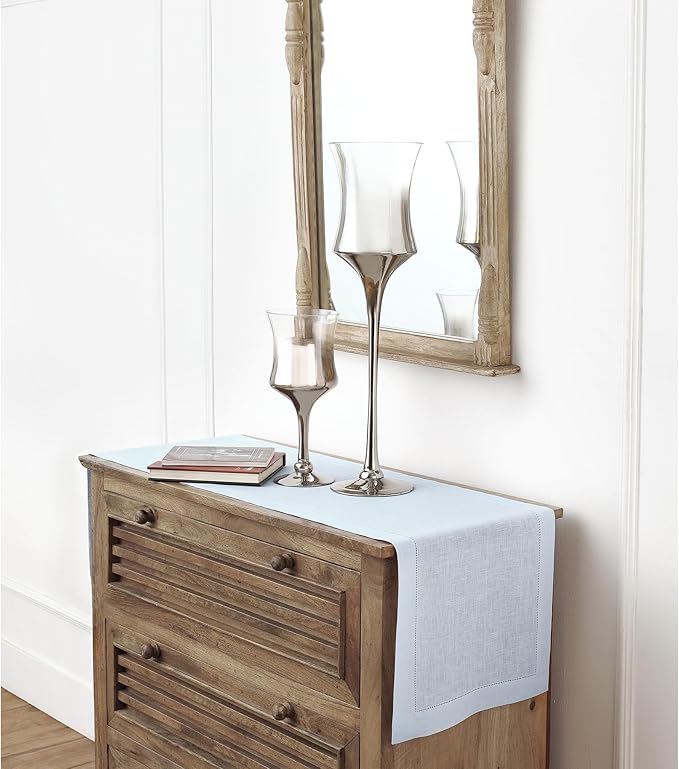 Solino Home Linen Light Blue Table Runner 60 Inches - Classic Hemstitch, 100% Pure Linen Coffee Table Runner 14 x 60 Inch Ideal for Dresser Tables