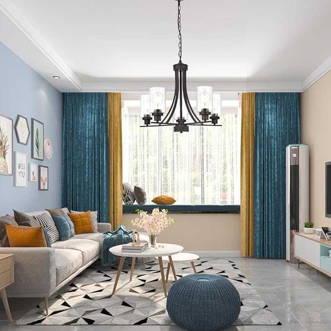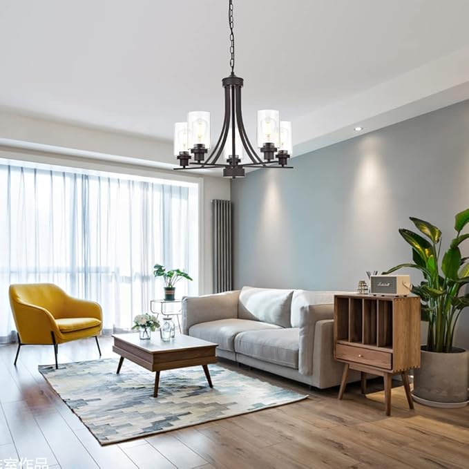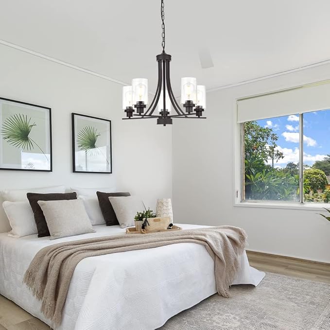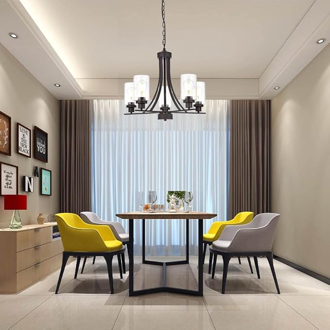 - 🌙 5 Light Glass Chandelier: This contemporary chandelier with high clear glass shades,it is an elegant update for traditional and modern homes alike.It's the perfect light fixture to install in kitchen, island, dining room,living room,foyers ,hallway,bedroom,coffee bar, lobby, restaurant and any space you like.