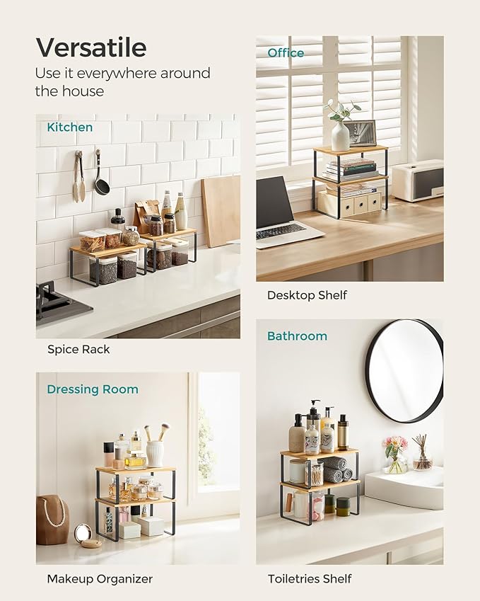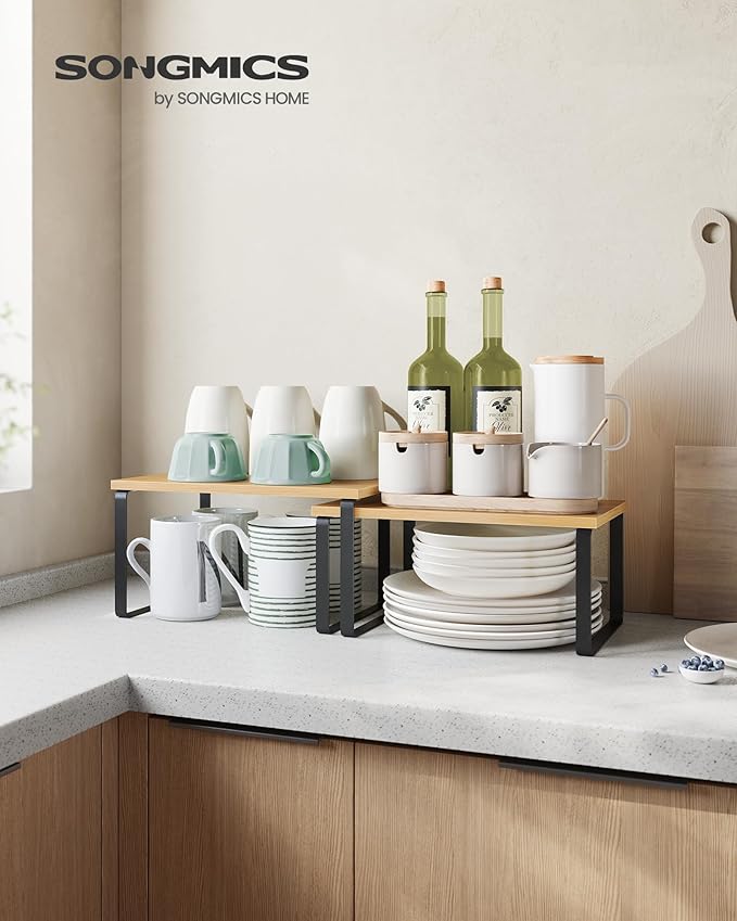 SONGMICS Cabinet Organizer Shelf, Set of 2 Kitchen Counter Shelves, Kitchen Storage, Spice Rack, Stackable, Expandable, Metal and Engineered Wood, Ink Black and Natural Beige UKCS02NB