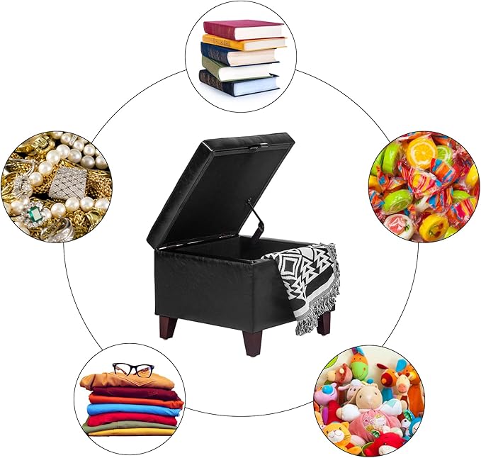 Adeco Storage Ottoman Foot Rest Stool, Leather Ottoman Footstool with Solid Wood Legs and Hinged Lid, 17.7" Small Foot Stool for Living Room, Bedroom