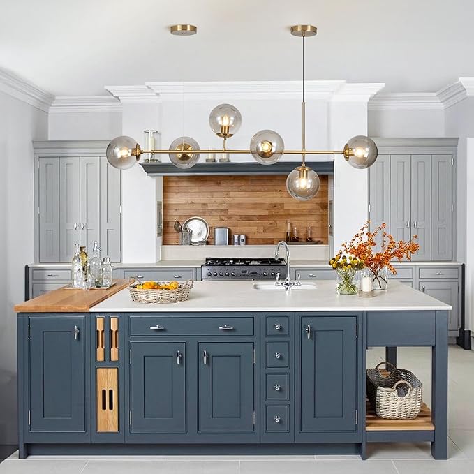 - 【Mid Century Rectangle Chandelier】The linear chandelier for kitchen island features six smoke gray glass shade and a long metal frame, which is characterized with a modern flair. The smoky glass shade diffuse the light to create a welcoming glow, adding a retro modern accent and ample illumination. The brushed brass hanging pendant light brings the drama of mid century modern pendant lighting over a kitchen island. The globe kitchen island chandelier is highlighting personality, and is favored by more and more people!