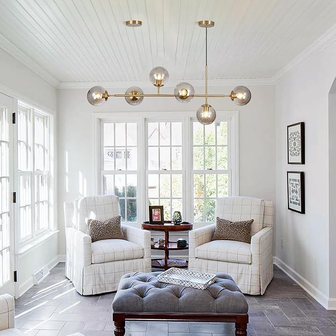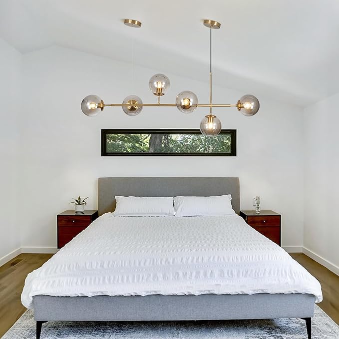 - 【Wide Application】The 6-light glass globe linear sputnik chandelier will lighting up your living space and bringing you a rich artistic atmosphere. The latest design with most modern look always match your home best! You can place it in living room, kitchen island, bedroom, dining room, kitchen sink, study room, guest room, master room, hallway, entryways, corridor foyer any room you like. The off center light fixture is also good for office, coffee bar, lobby, restaurant.