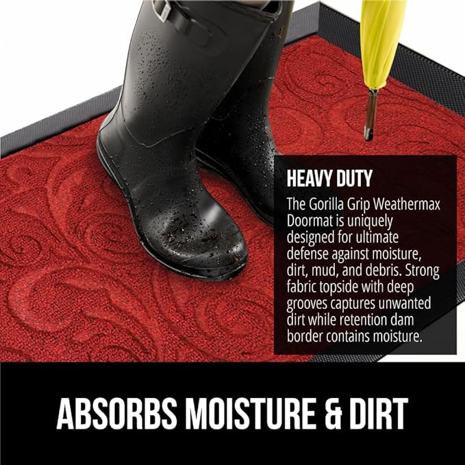 GORILLA GRIP 100% Waterproof All-Season WeatherMax Doormat US Designed Natural Rubber, Stain and Fade Resistant, Low Profile Indoor Outdoor Door Mats, Easy Clean Patio Mat, 17x29, Red Vintage Wine