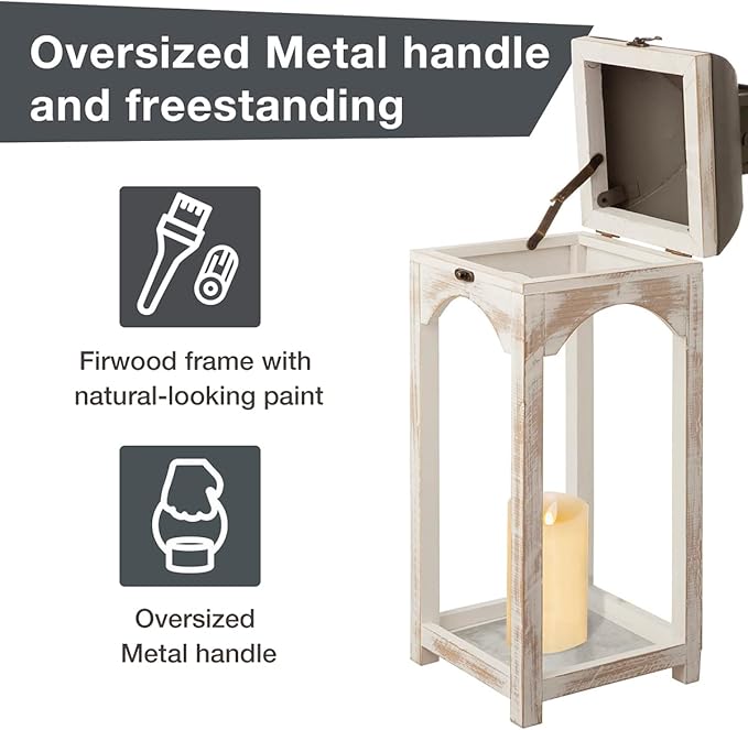 - FARMHOUSE DESIGN -- Painted by hand of white firwood with the roof in vintage style, this candle lantern features reflective galvanized metal floors. The knob top features a decorative loop. Each has a beautiful swing latch.