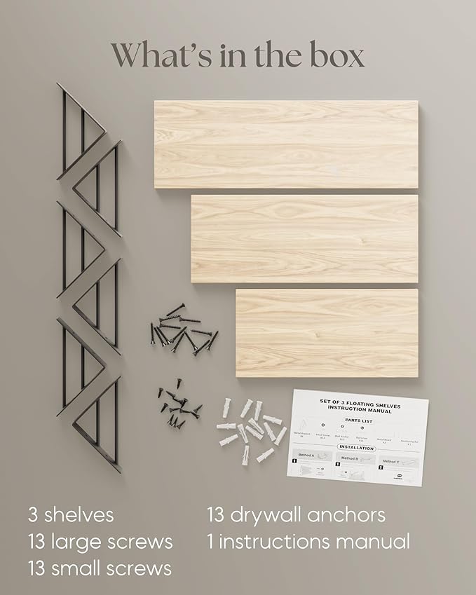 - 【Simple Combinations, More Creativity】 Added triangle design elements to provide two different display methods. Install these shelves with the board on top of the brackets or below to provide more choices for your layout. Choose your favorite look and create your own personal style. Natural Wood boards can be DIY stained.