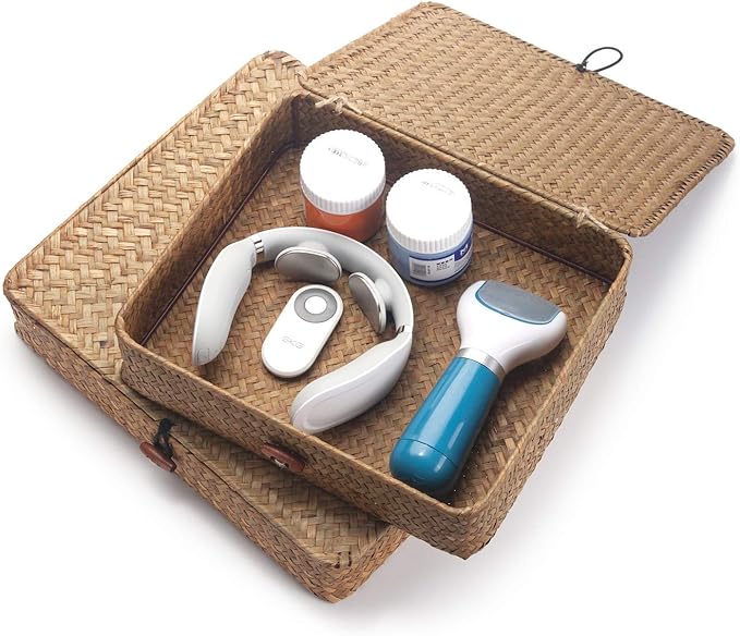 Seagrass Storage Basket Box with Lid Rectangular Woven Shelf Baskets Bins for Organize Snack Toys Set of 2 Natural Decorative(Large+Small)