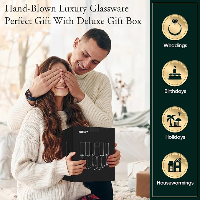 - Classy Gift With Gift-ready Packaging: Elegant and exquisite wine glasses often need more high-end packaging boxes to reflect.Order these long stem champagne flutes for yourself or as a thoughtful housewarming gift idea for a special friend, and you can be sure to win their appreciation!