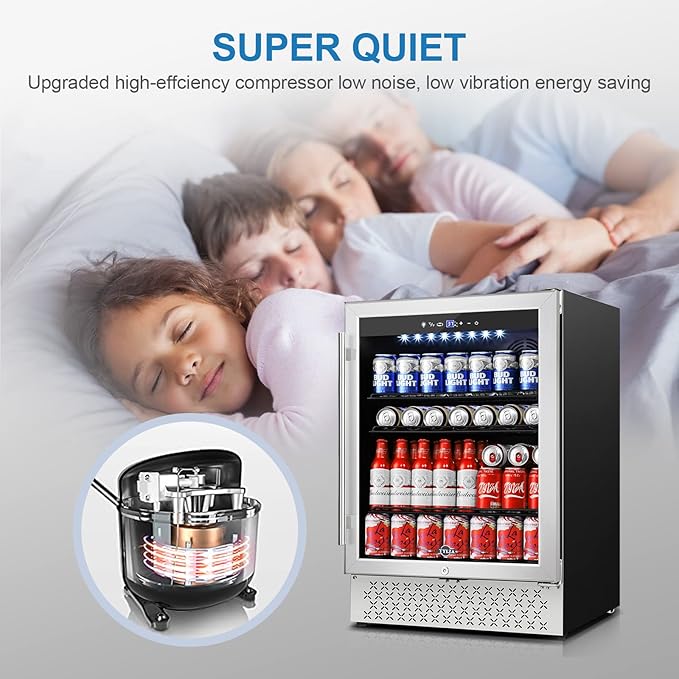 Tylza Beverage Refrigerator 24 Inch, 190 Can Built-in/Freestanding Beverage Cooler Fridge with Glass Door and Advanced Cooling Compressor for Beer and Soda or Wine, Low Noise, 37-64 F
