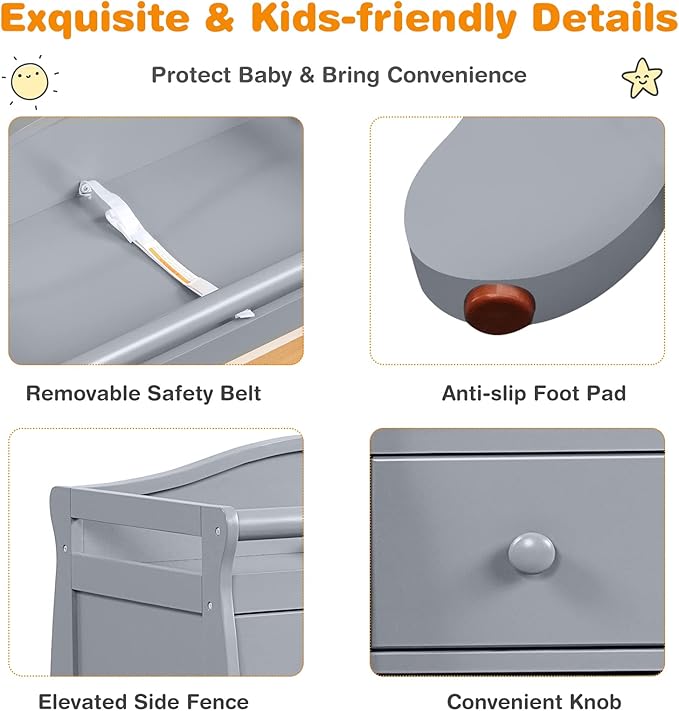 - Safe & Stable Construction: The changing table dresser is strongly supported by four sturdy legs and the changing top can hold up to 176 lbs. Each leg is equipped with anti-slip foot pad to avoid slipping and wobbling. Plus, safety belt and raised rails will help protect your baby from falling.