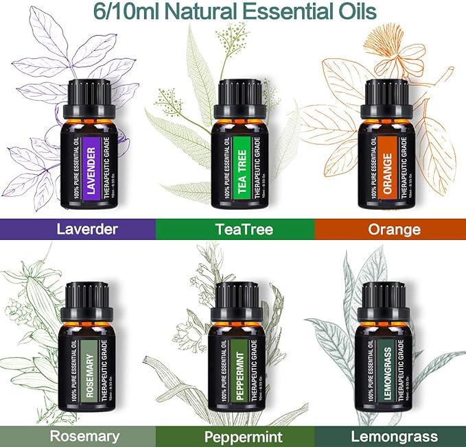 - 💕【Diffuser and 6 essential oils】The set included a diffuser and 6 essential oils. All oils are extracted from natural plants, 100% pure. And it using the most advanced ultrasonic diffusion technology to atomize essential oils.