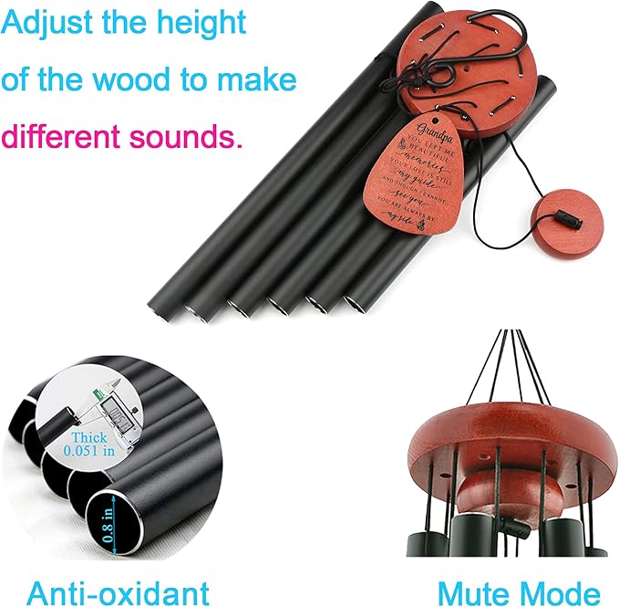 - Premium Quality Memorial Wind Chimes: Made with high-quality aluminum tubes and a corrosion-resistant black anodized finish, these memorial wind chimes produce clear, beautiful tones. The bell holder, striker, and wind catcher are made from durable beech wood, and the entire structure is supported by a strong, weather-resistant nylon cord for lasting outdoor use