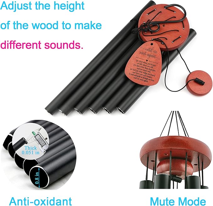 - Premium Quality Memorial Wind Chimes: Made with high-quality aluminum tubes and a corrosion-resistant black anodized finish, these memorial wind chimes produce clear, beautiful tones. The bell holder, striker, and wind catcher are made from durable beech wood, and the entire structure is supported by a strong, weather-resistant nylon cord for lasting outdoor use