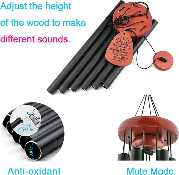 - Premium Quality Memorial Wind Chimes: Made with high-quality aluminum tubes and a corrosion-resistant black anodized finish, these memorial wind chimes produce clear, beautiful tones. The bell holder, striker, and wind catcher are made from durable beech wood, and the entire structure is supported by a strong, weather-resistant nylon cord for lasting outdoor use