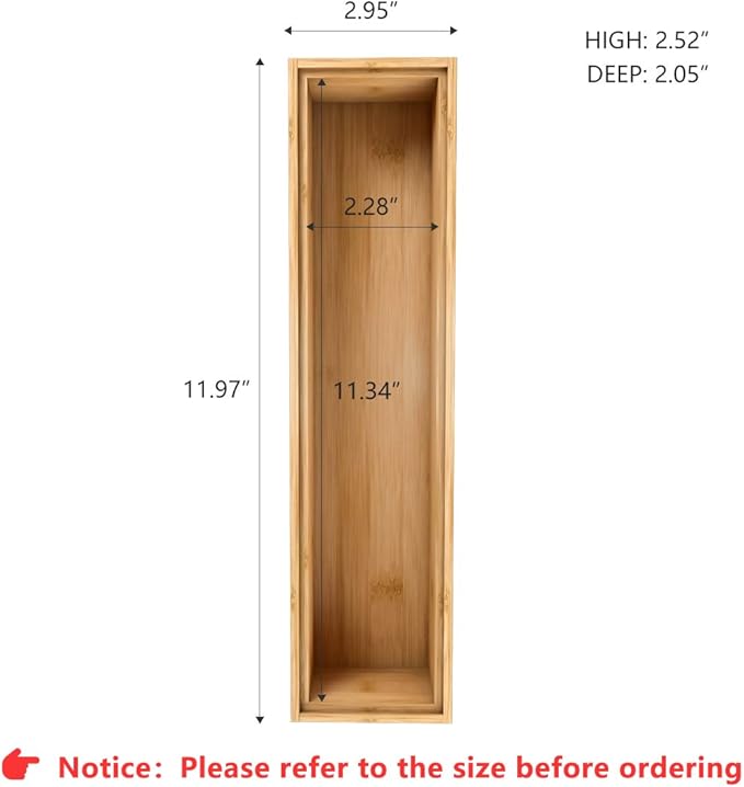 - 【2.5" High Storage Box Organizers】 The height of Bambloom drawer organizer is up to 2.5 inch, which gives more space to storage item like sponns, knife or other little things. Its deep compartmentments make it a practical storage box for drawers. (PLEASE NOTE: Please measure your drawer/space before ordering. If you want the boxes to fit a specific space, allow a little breathing space for any small variations in size that may result during manufacturing.
