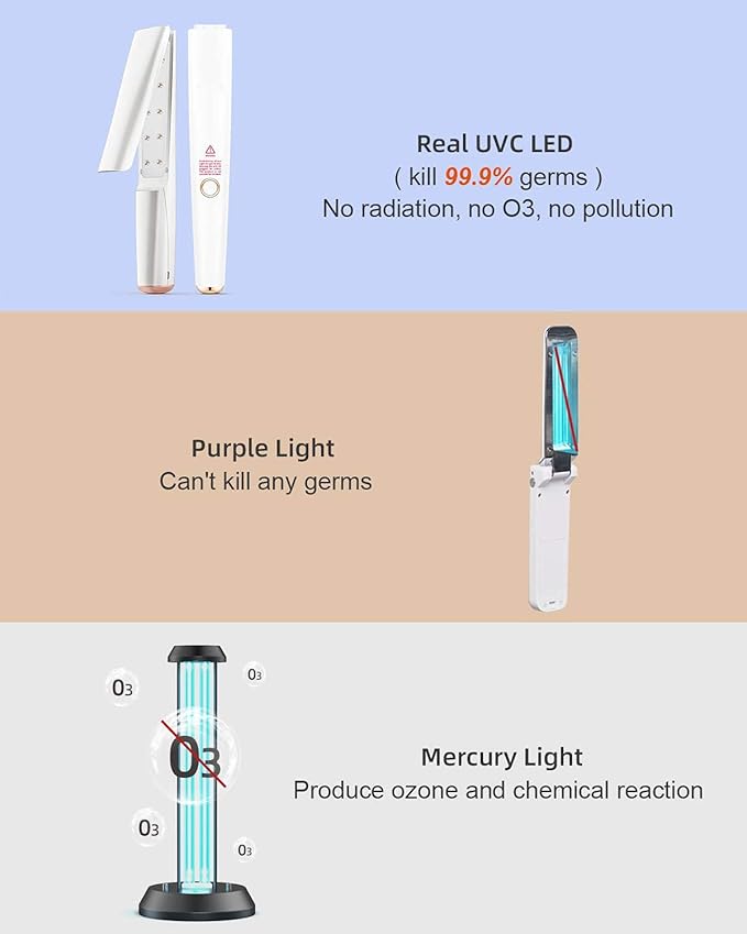 - No SECONDARY POLLUTION: UV sanitizer no more portable wipes or harsh chemicals are needed to sanitize your items. The UV light sanitizer wand is different from purple light, UVC light sanitizer will not leave behind any chemical odor or residue
