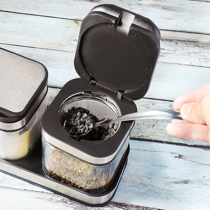 - Sugar Container with spoon and cover, small stainless steel spoon can go in the little slit in perfectly. It really helps with controlling the amount of seasoning when you are cooking.