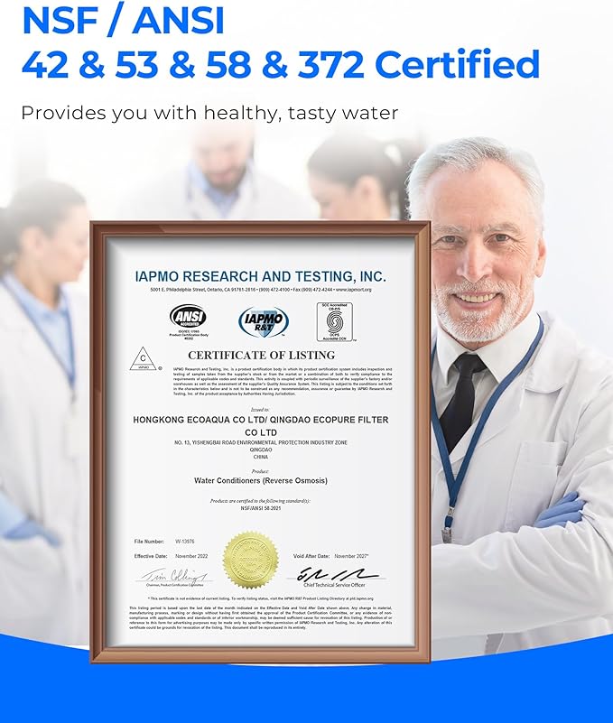 - 【NSF/ANSI standard 42 & 53 & 58 & 372 certified】This tankless reverse osmosis system is certified by IAPMO R&T against NSF/ANSI 58 for reduction of TDS. Also it has been tested and certified against NSF 42 & 53 to reduce chlorine, bad taste, odor and so on. Besides, the system is certified by NSF/ANSI 372 for lead-free materials.
