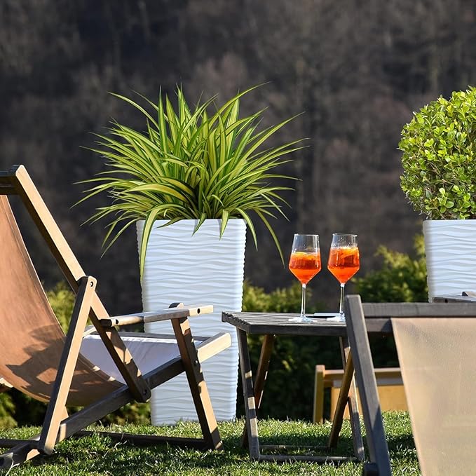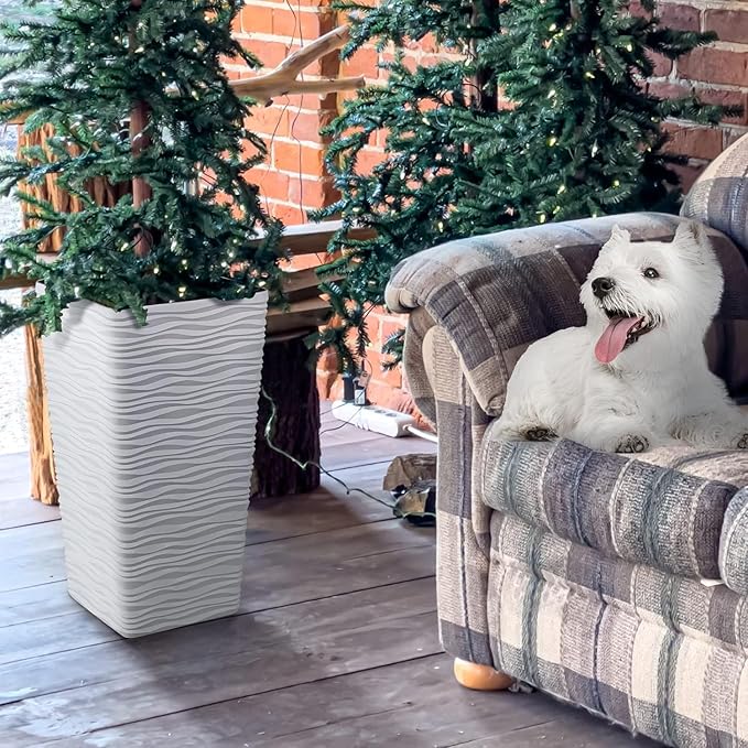 Worth Garden 22" Tall Planters Set of 2 - Plastic White Square Plant Pots - Modern Big Tapered Matte Wavy Tree Flower Pot for Indoor Outdoor Porch Deck