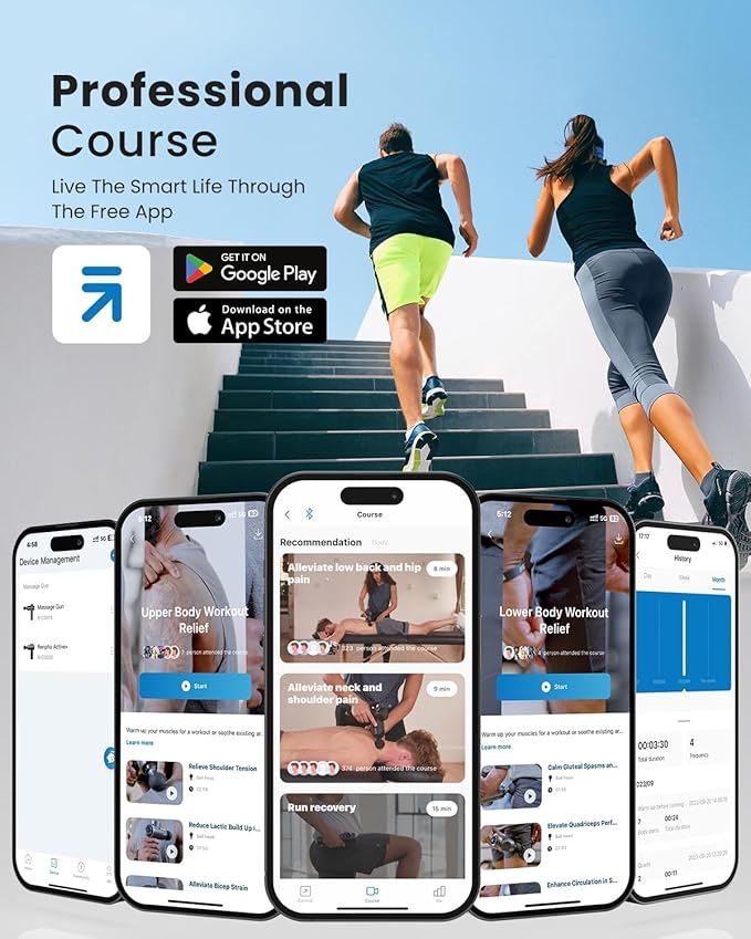 - Smart Personal Muscle Therapy: Connect the deep tissue massage gun to Renpho Health app via Bluetooth to access professional video courses tailored for specific muscle groups, synchronize your massage, control speed levels, and track your massage history