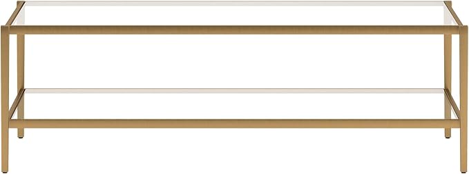 Henn&Hart 54" Wide Rectangular Coffee Table with Glass Shelf in Antique Brass, Modern coffee tables for living room, studio apartment essentials