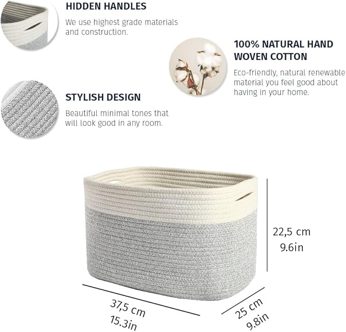 OrganiHaus Woven Basket for Storage, Baby Room Furniture, Decorative Towel Baskets for Bathroom, Cotton Rope Basket for Storage, Woven Baskets for Organizing, Rectangular Storage Basket, Grey