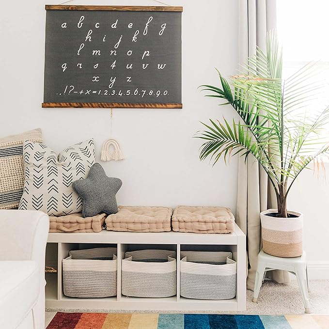 - Discrete, Built-In Carry Handles – These fabric rope baskets for storage also feature slim hand holds built right into the sides of each basket for a seamless look that’s also functional. Perfect for picking up toys or carrying items around the house.