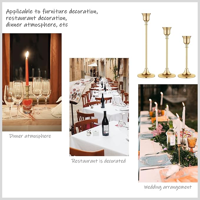- 👍【Sturdy and Stable】Made of solid, durable, high-quality aluminum alloy material,this brass candlestick holder is durable and sturdy enough to hold tall taper candles. Each gold candle stick holder set can fit 3/4 inch and 7/8 inch small pillar candles as well as LED cone candles to match your dining table decor.It provides a stable base for your candles,ensures stability and longevity for your candles.