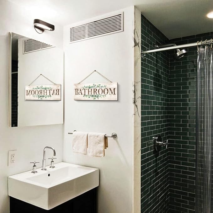 Bathroom Sign Wall Decor, Bathroom Wall Art with Plant Print, Rustic Farmhouse Wall Hanging Plaque Home Kitchen Decorative Bathroom, 4.7 x 13.7 inches