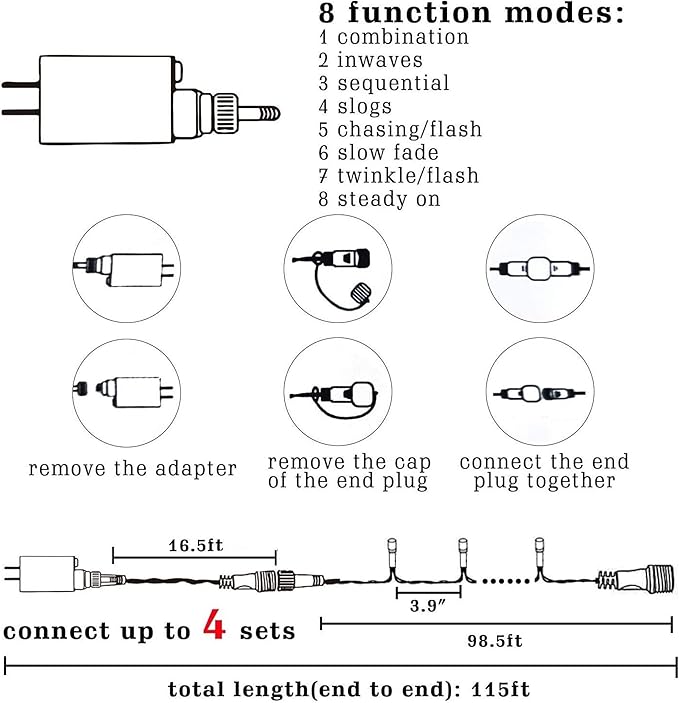 - 8 Modes: Dazzle Bright 300 LED string lights with 8 light modes: combination, in waves, sequential, slogs, chasing/flash, slow fade, twinkle/flash, by pressing the button on the plug to change the mode, using different pattern to fit different application require.