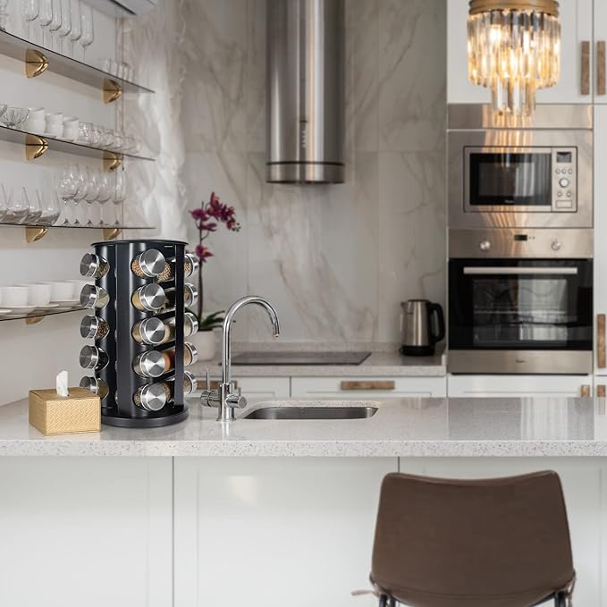 Black Countertop Revolving Spice Rack, Empty 20-Jars Rotating Spice Rack Organizer, Round Carousel Tower, 135 Spice Labels with Funnel Complete Set, for Kitchen Countertop, Cabinet