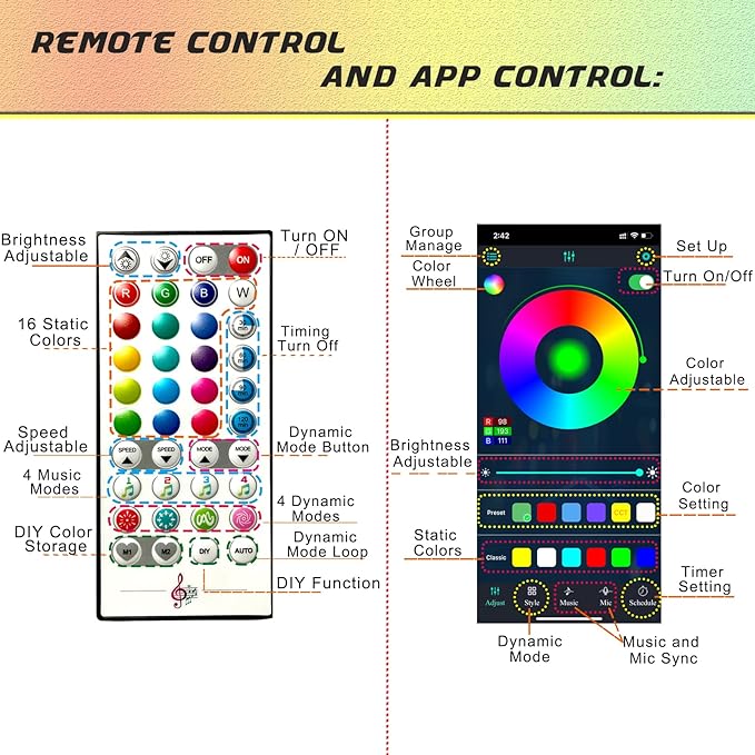 - Multi-Function: The sound activated led lights offers 16 million colors, 213 dynamic modes, music sync, timer, DIY, dimmable etc functions. It creates a wonderful atmosphere for you.