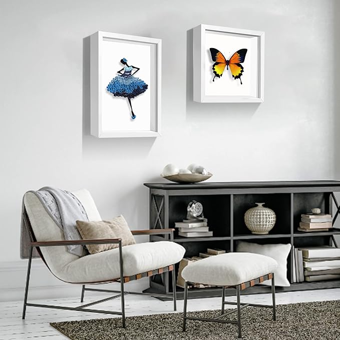 - Size: The white shadow box size 5x7 inches with an exterior depth of 1.8 inches and the internal dimension is 4.7x6.7 inches with an interior depth of 1.2 inches.