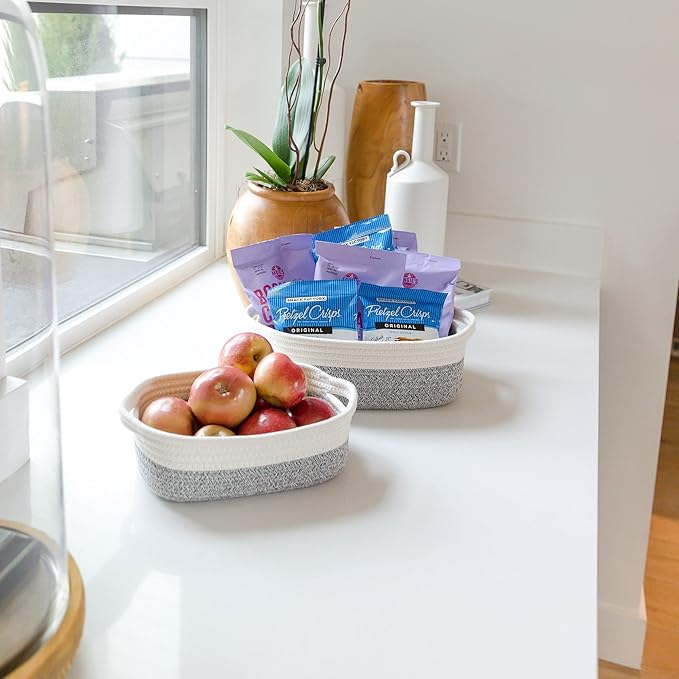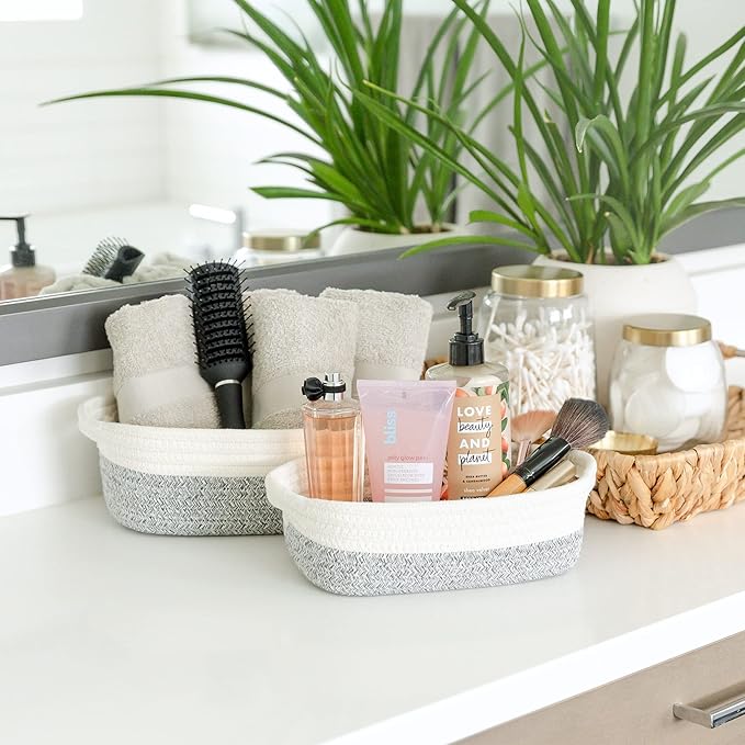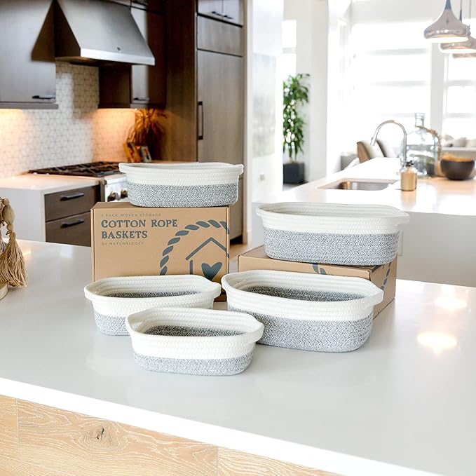 - 5 BASKETS FOR 5X THE ORGANIZING POWER: Life is messy...but your house doesn’t have to be! With 5 beautiful rope baskets for organizing, you’ll defeat messy rooms like a true supermom! Use the largest baskets for Montessori displays or countertop fruits holder, create the cutest dog toy storage or bathroom hand towel holder with the medium ones and stash jewelry or keys in the smallest. Biggest (11.8"x8.7"x4.3"), (11"x7.9"x3.9"), (10.2"x7.1"x3.5"), (9.1"x6.3"x3.1"), Smallest (7.9x5.5"x2.8")