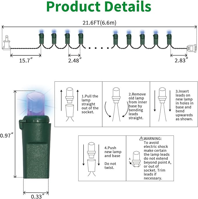 - 5mm LED Christmas Lights: 100 counts warm white 5mm wide angle stable LED string lights spaced 6.3 inches apart with green wire. 7.1 inch leads have a stackable male plug and 5.9 inch tails have a female plug for easy end to end connection.