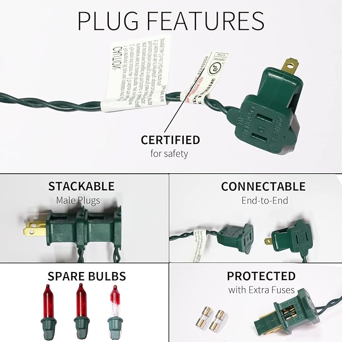 - Product Nature:Each mini Christmas light set comes with end-to-end plug, can be connectable up to 5 sets (500 lights). Each bulb space 2.5in, 2.5V and 0.425W per bulbs, built-in 3A fuse for safe use. Extra bulbs and fuses are included.