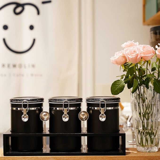 - KEEP THE DESKTOP TIDY: The coffee Containers set includes a wooden storage shelf and 2 Silver iron coffee spoon, which not only facilitates users to organize and categorize similar foods, make the desktop more tidy, and use the cans more conveniently, but also can decorate your desktop and let Your desktop is no longer monotonous.