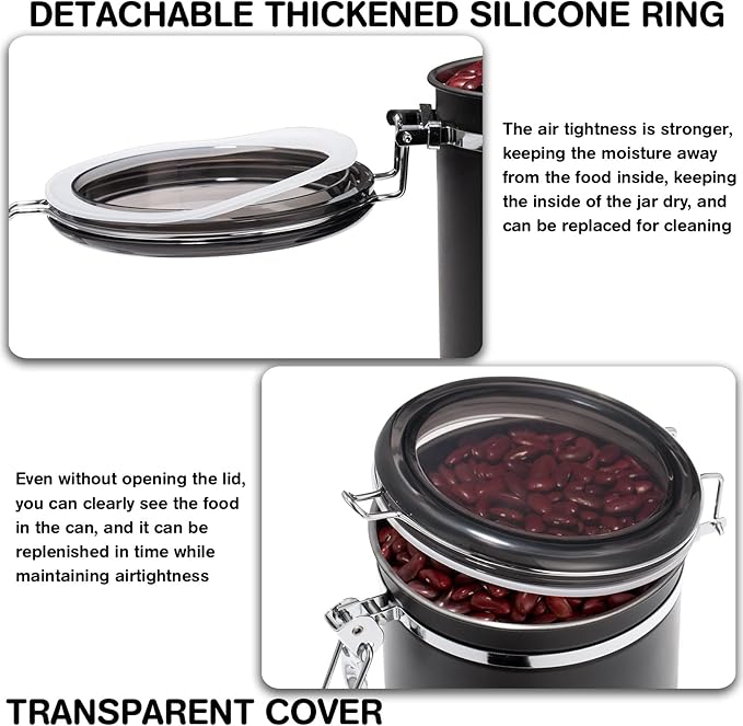 - SEALS WELL & AVOIDS SUNLIGHT: this stainless steel coffee container has a metal lock and a silicone gasket, which not only meets the storage of sunlight avoidance food, preventing coffee and other food from accelerated deterioration due to sunlight, etc., but also this design makes it easier for the user to open and close the container, and also prevents moisture from entering in the air to avoid harmful oxidization and keep the jar dry, which helps to keep the freshness of the coffee beans.