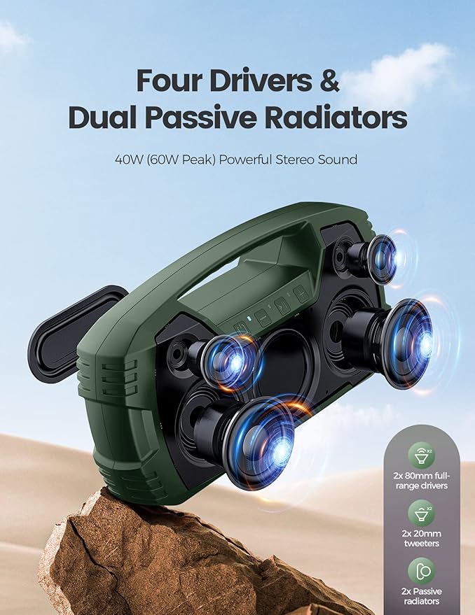 - Powerful Stereo Speaker - Featuring 4 dedicated drivers with 2 15W full-range drivers and 2 5W tweeters, along with 2 passive radiators on the front and rear, this loud Bluetooth speaker delivers 40W surround sound (peak 60W) and pumps out well-balanced midrange, crisp treble, and punchy bass with virtually no distortion, letting you enjoy the music to the utmost. Pair 2 speakers together for 80 watt stereo sound