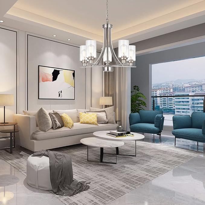 - 💎 5 Light Glass Chandelier: This industrial kitchen island chandelier with high seeded glass shades,it is an elegant update for traditional and modern homes alike.It's the perfect light fixture to install in kitchen, island, dining room,living room,foyers ,hallway,bedroom,coffee bar, lobby, restaurant and any space you like.