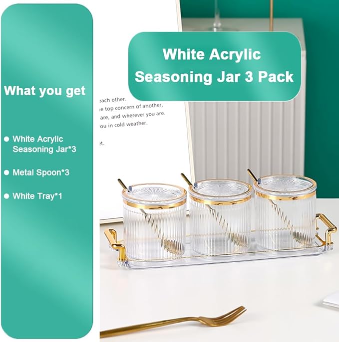 - ▲▲【Material】: Transparent thickened acrylic condiment container, made of PP plastic, equipped with 3 metal spoons and a practical tray with a handle, sturdy and corrosion-resistant, it can be effectively stored while decorating home life, adding color.
