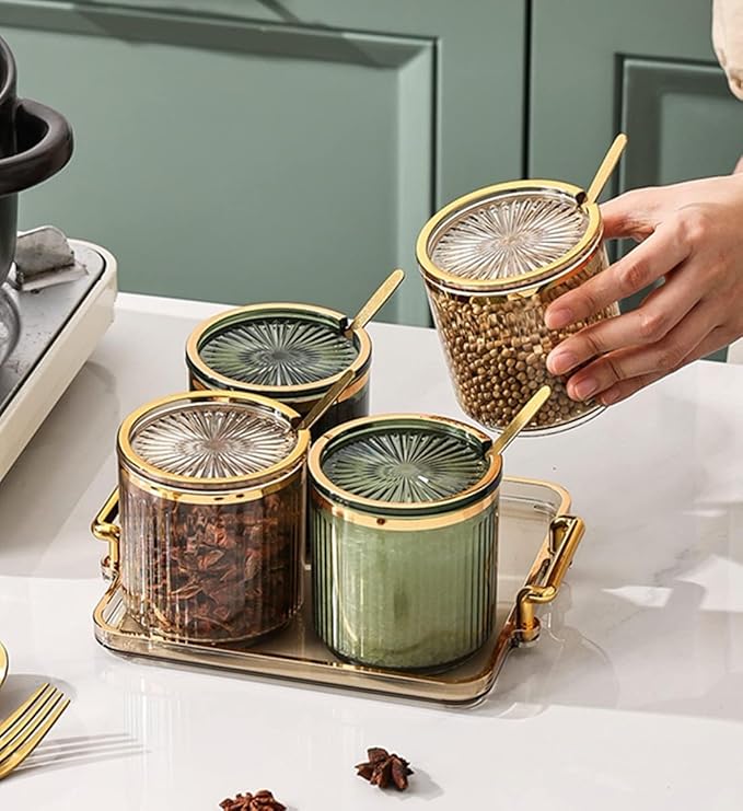 - ▲▲【Material】: Transparent thickened acrylic condiment container, made of PP plastic, equipped with 4 metal spoons and a practical tray with a handle, sturdy and corrosion-resistant, it can be effectively stored while decorating home life, adding color