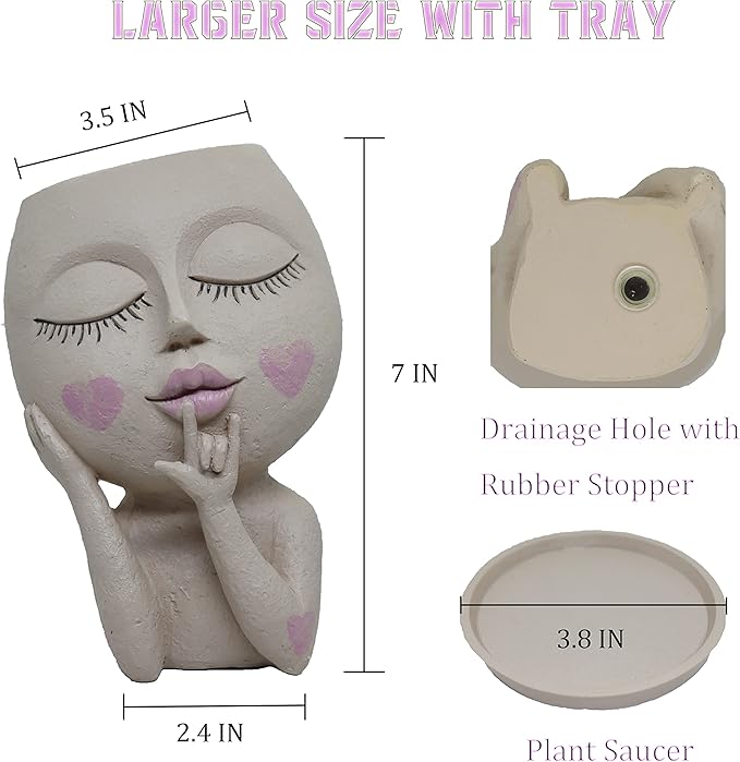- 🌵 Size of Planter Pots: The size of this unique head vase is carefully designed by us. Based on sociology and aesthetics, we found this size to be the perfect way to make this vase funny and cute. The opening diameter of the flower planter is 3.5 inches, bottom length is 2.4 inches, height is 7 inches. The Diameter of the tray is 3.8 inches.