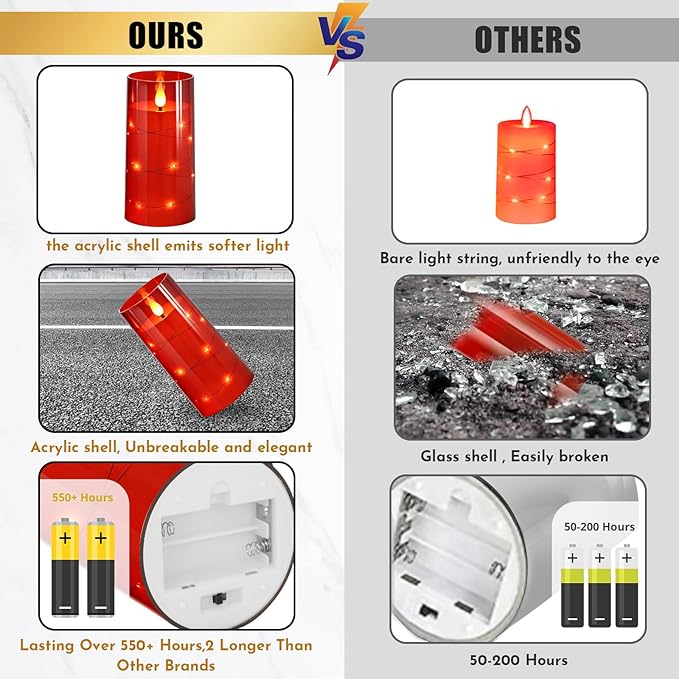 - 【Unbreakable Material, Realistic Appearance】flameless candles are made of high quality acrylic. Compared with glass radiance candles, acrylic shells make the battery candles stronger and lighter. Through the clear shell, you can see the real flame effect