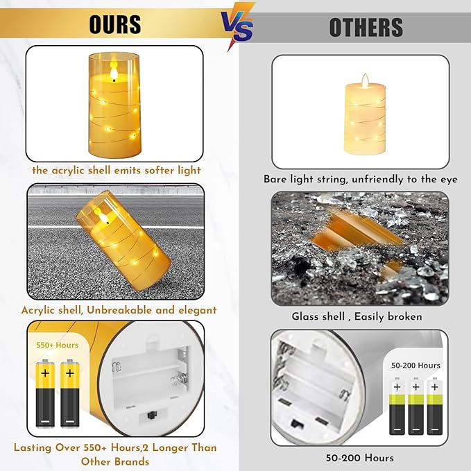 - 【Unbreakable Material, Realistic Appearance】flameless candles are made of high quality acrylic. Compared with glass radiance candles, acrylic shells make the battery candles stronger and lighter. Through the clear shell, you can see the real flame effect