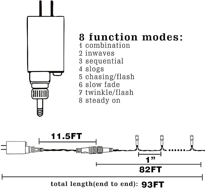 - 8 Lighting Modes: There are 8 lighting modes can be chosen: combination, in waves, sequential, slo-glo, chasing/flash, slow fade, twinkle/flash, steady on. You can choose different modes according to your mood and the atmosphere you want to create.